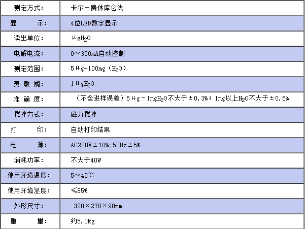 儀器符合GB/T7600;SH/T0246;GB/T606及采用卡爾—費休法測定樣品中水分的有關標準。儀器采用了先進的自動控制電路,電解電流自動跟蹤控制,外型結(jié)構(gòu)新穎,從而使該儀器工作更可靠, 使用更方便,具有分析速度快(一分鐘出結(jié)果)、操作簡便、精度高、自動性強等特點, 同時具有自動打印功能,可將實驗結(jié)果、做樣時間、樣品編號自動打印出來, 廣泛應用于石油、化工、電力、鐵路、環(huán)保等部門。